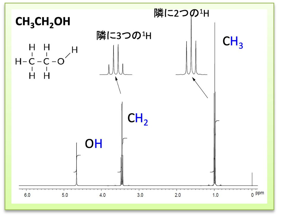 让我再解释一下由于耦合而产生的分裂模式。未分裂的信号称为单峰,用符号“s”表示。分成两部分的信号是双峰,用符号“d”表示。分成三部分的信号是一个三元组,用“t”符号表示。三元组的信号强度比按 1:2:1 的模式划分。分成四个的信号称为四重奏,用符号“q”表示。四重奏的信号强度比为1:3:3:1。乙醇11H NMR 谱为例1我将解释 H 信号的分裂。CH 约 1ppm3,CH31H的数量为2(CH2),被分割成2+1=3。CH 约 35ppm2,CH21H的数量为3(CH3),被分割成3+1=4。5ppm左右的OH信号不与附近的H耦合,因此不会分裂并成为单线态。基本上,可以看出信号被分成存在于感兴趣的核自旋周围的其他核自旋的数量+1。