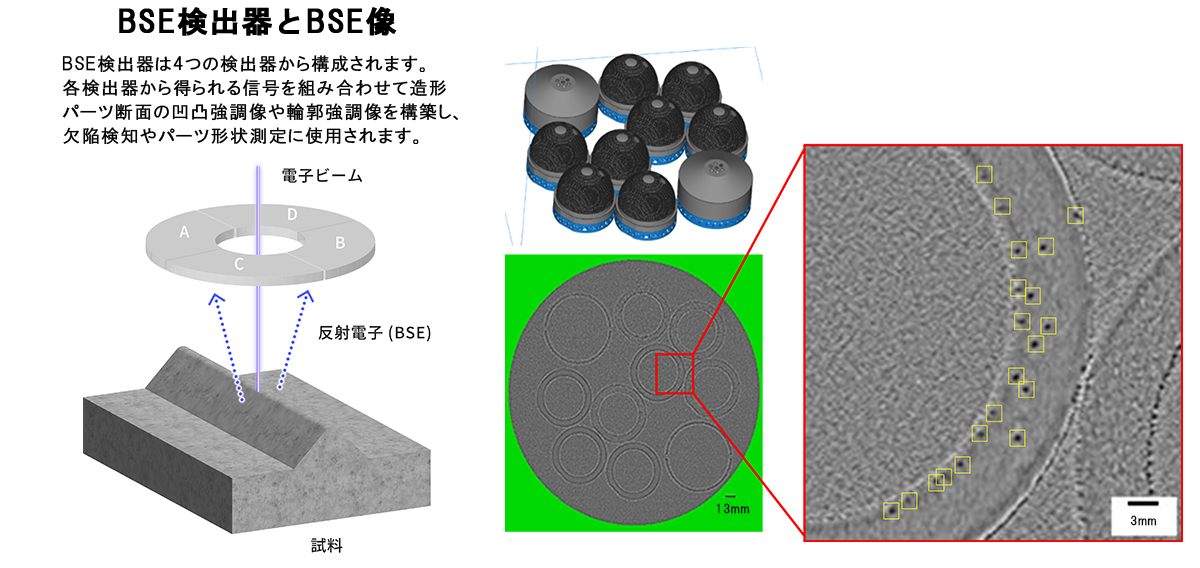 JEOL 开发了电子显微镜制造商独有的 BSE(背散射电子)监测功能。可以捕获从电子束发射的BSE(背散射电子),并可以现场观察熔融表面的凹凸。我们使用电子显微镜技术来检测激光束无法检测到的反向散射电子,以进行印刷质量控制。该功能的目的是通过电子束熔化Ti64粉末,然后再次用相同的电子束照射整个熔化表面来获得BSE图像,并从横截面图像中自动检测内部缺陷和零件变形。可以在打印过程中进行现场观察,确保建模对象的质量。目前仅限于Ti64材料,可以使用BSE观察内部缺陷。我们计划将来将其适应其他材料。