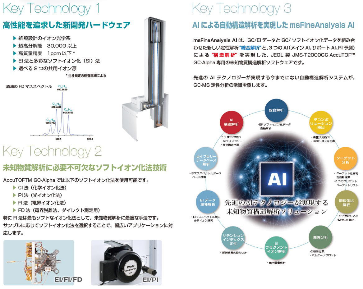 首先,能够进行高分辨率测量的硬件在质谱仪中拥有一流的性能。 其次,支持多种软电离(FI、PI、CI)方法,可在不破坏分子离子的情况下进行电离,让您结合GC-MS标准电子电离(EI)方法提取更多结构信息。 第三,使用利用人工智能的专用软件可以有效地对获取的数据中包含的未知物质进行结构分析。