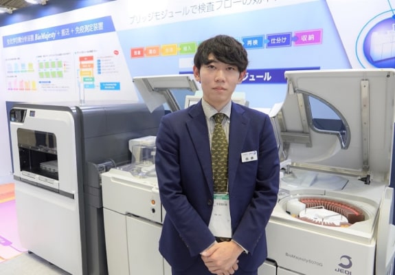 我们主要展出BioMajesty™系列全自动生化分析仪的实机。此外,我们还推出了可连接自动化生化分析仪和自动化免疫分析仪的“生化/免疫桥模块”、临床实验室信息处理系统“CLALIS™”和试剂“BM Test™”,已扩展到包括35个项目,将我们的解决方案的价值与我们的产品联系起来。我们请 ME 解决方案销售部门的 Yuta Shindo 来解释展览内容。