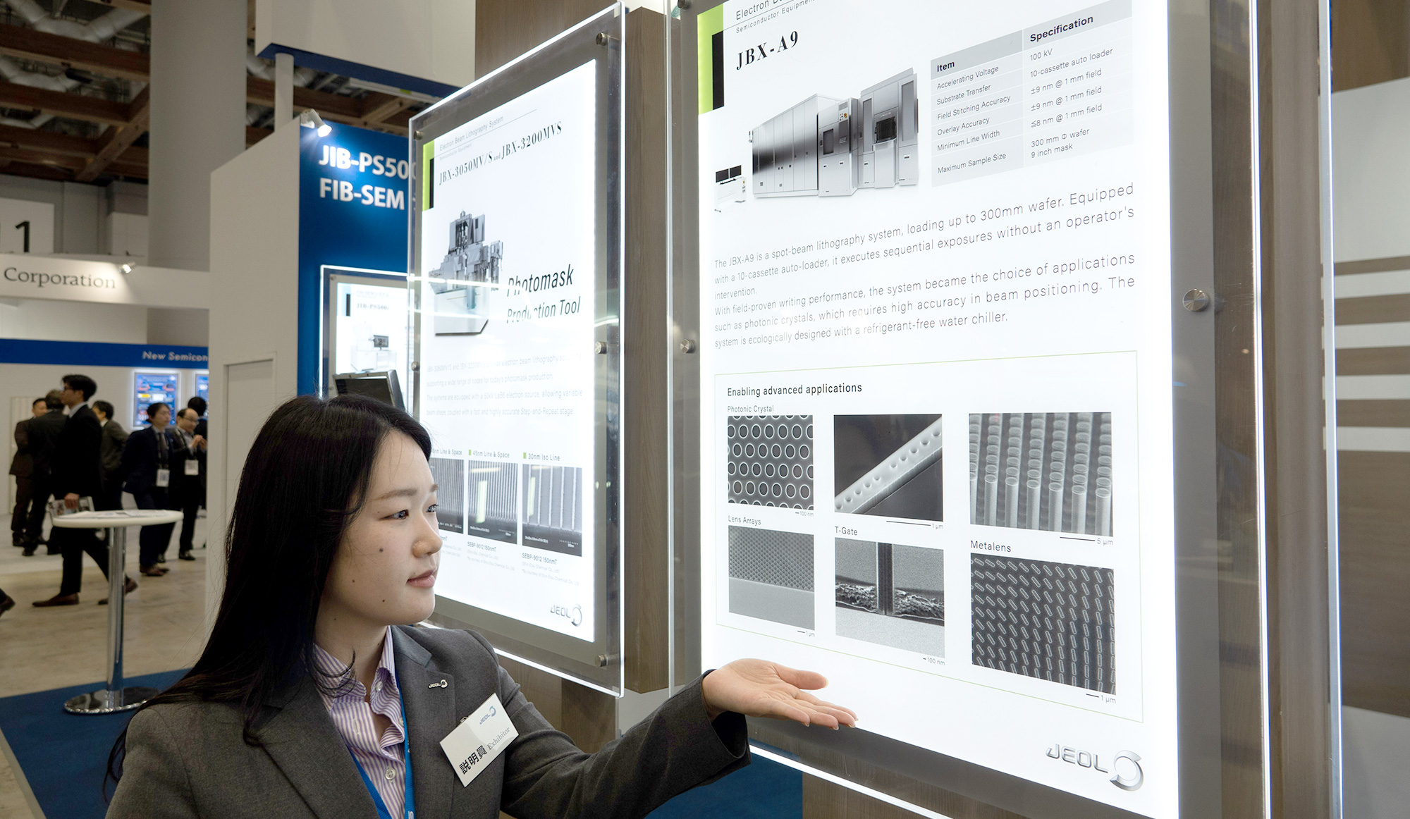 JBX-A9是基于JBX-8100FS的点光束写入设备,具有更高的写入精度和吞吐量。此外,支持最大 300 毫米晶圆也引起了参观者的注意。