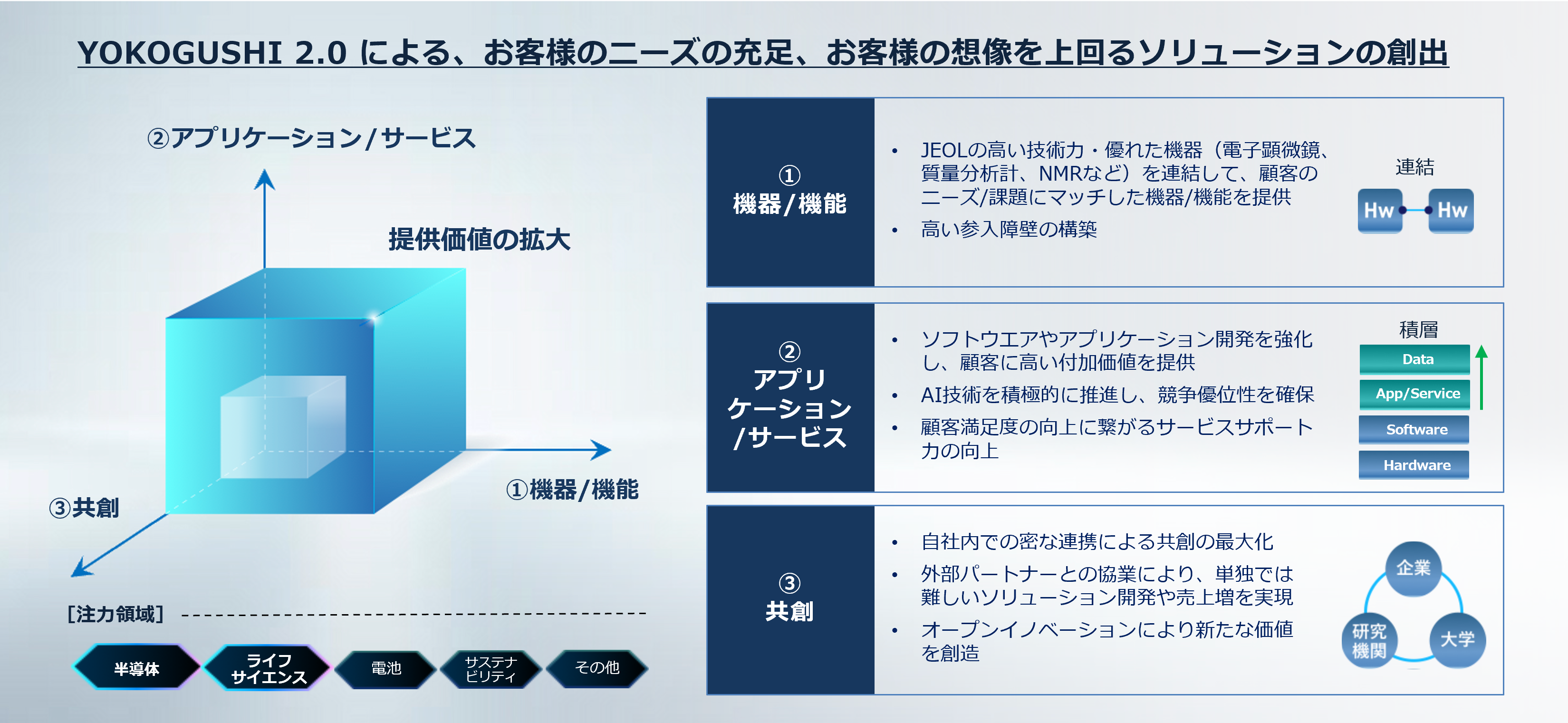 我们将把“YOKOGUSHI”发展为“YOKOGUSHI 20”,并通过三个轴(①设备/功能,②应用程序/服务,③共同创造)的创新和扩展创造高附加值,强化特定领域的解决方案。