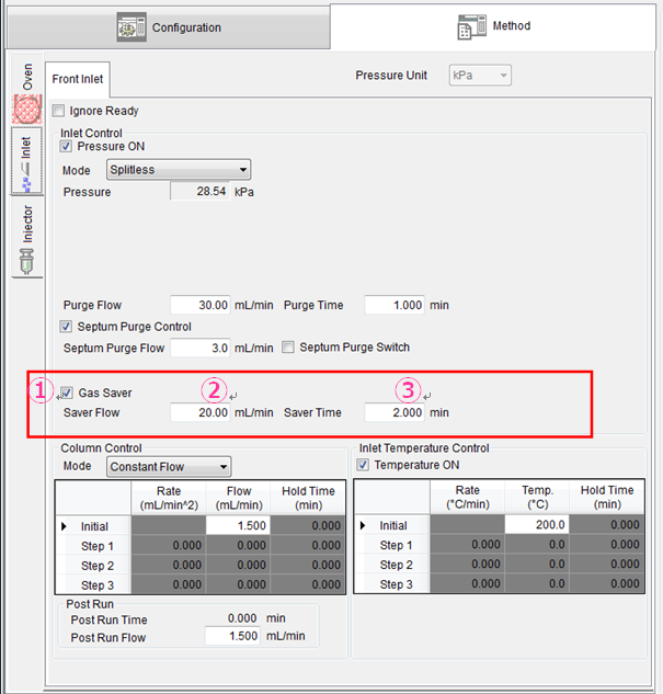 ③ 从进样时间开始,输入开始保存载气的时间作为 Saver Time。 - 使用任意文件名保存修改后的条件。