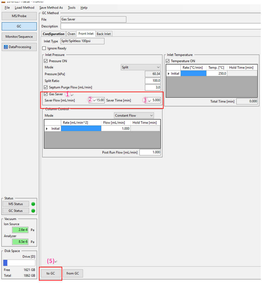 - 点击“至 GC”将编辑后的气体节省条件发送至 GC 主机并启用气体节省。