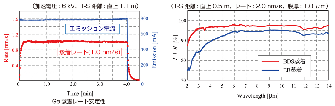 用于红外透射膜的锗可以以高速率沉积(比传统方法快 40 倍),从而提高吞吐量。此外,内衬形状的设计可抑制蒸镀过程中的飞溅,从而实现稳定的蒸镀和低光吸收的成膜。