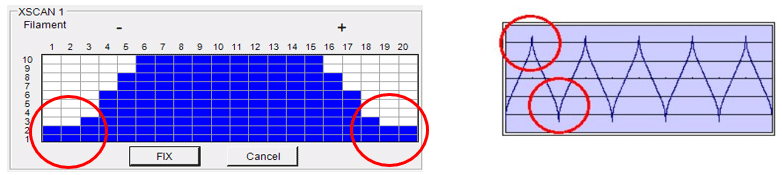 通过在 X 方向的两端应用峰化,可以减少两端的光束停留时间并使熔体痕迹变平。