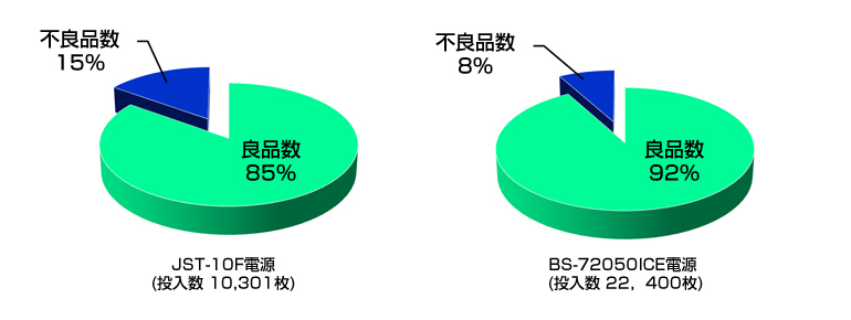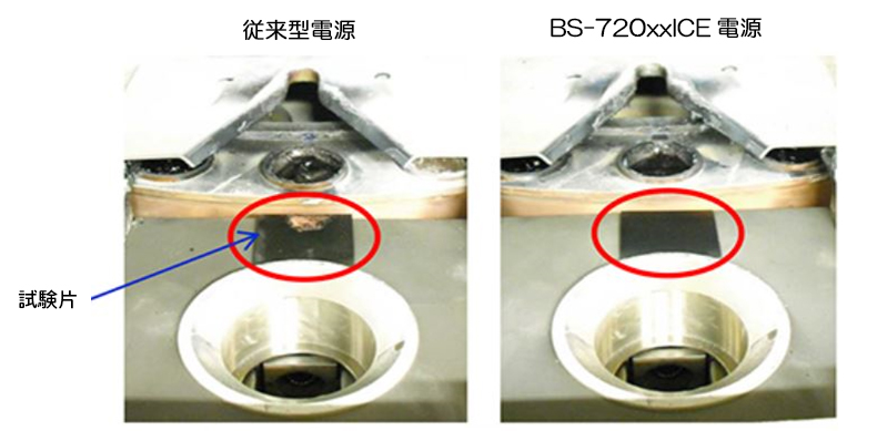 用户使用 JST-10F 电源和 BS-72050ICE 电源以量产水平生产了 UV-IR 截止滤光片,并比较了产品质量。使用BS-72050ICE电源时,由于异常放电时的快速恢复性能以及通过扫描调整功能改善熔痕,因此与使用JST-10F电源时相比,成品率得到了提高。