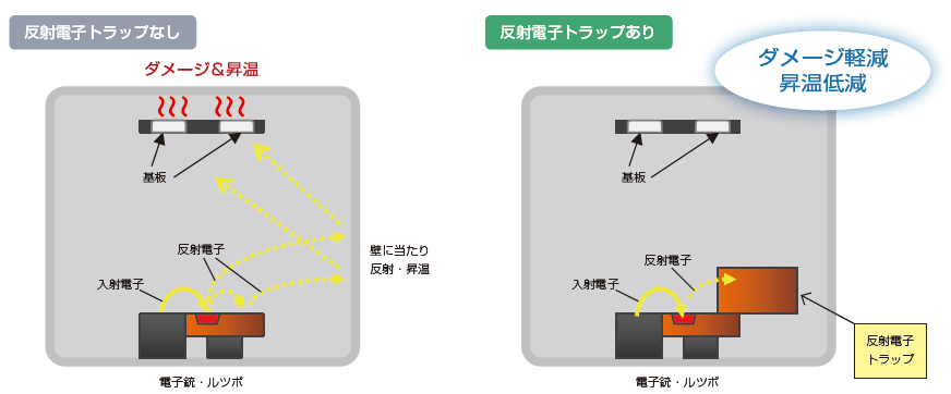 在电子束蒸镀过程中,入射到蒸镀材料上的部分电子以反射电子(背散射电子)的形式发射出来,当它们到达基板时,可能会对基板造成损坏,使温度升高,降低薄膜附着力。背散射电子陷阱是一种可以与电子枪结合使用的装置,可显着减少进入基板的背散射电子量。它还可以对现有的气相沉积设备进行改造。