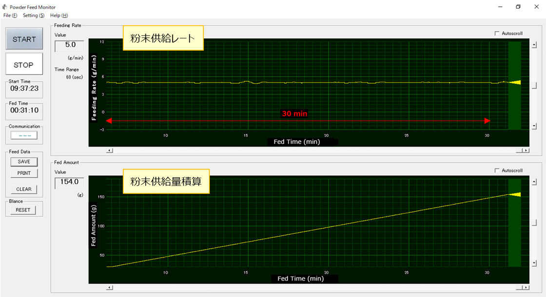 由配备送粉装置的电子天平的测量值实时计算、监控和记录送粉速率和送粉量。