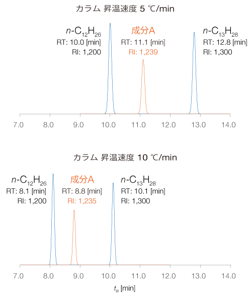 每种化合物都具有独立于 GC 条件的唯一 RI 值,因此为各种化合物创建 RI 值数据库可以用作化合物鉴定的强大信息。在右侧的示意图中,通过改变柱加热速率并在每种条件下测量标准正烷烃来计算“组分A”的RI值,但RI值几乎没有变化。