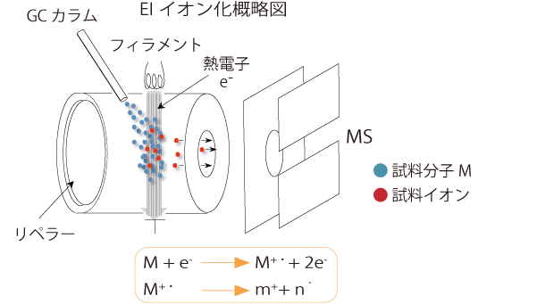 这是 GC-MS 中使用最广泛的电离方法。该方法通过用灯丝发射的热离子电子照射气相中的样品分子来产生离子。由于样品分子必须处于气态才能被电离,因此这种电离方法非常适合与 GC 连接。由于EI法是最难的电离方法,因此观察到许多碎片离子。每个观察到的离子的相对强度(谱图)具有很高的再现性,通过将谱图与数据库中记录的EI质谱进行比较,可以轻松地进行定性分析。 EI质谱数据库包含的化合物数量超过30万种,丰富数据库的存在扩大了GC-MS的应用范围。