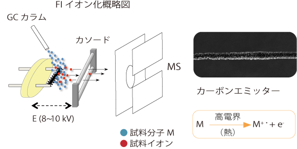 这是一种在发射器和对电极(阴极)之间施加大约8至10 kV的电压,样品分子中的电子由于隧道效应而移动到发射器,从而使样品分子电离的方法。 FI 方法是一种主要用于 GC 的电离方法,其中接近发射器的气态样品分子被电离。 FI 方法被归类为碎片较少的软电离方法,因为电离过程中接收到的内部能量小于 1 eV,远小于 EI 和 CI 方法。主要产生分子离子,但根据化合物的极性,也可能产生质子化分子。这是一种可与 JEOL GC-TOFMS 系列一起使用的电离方法。