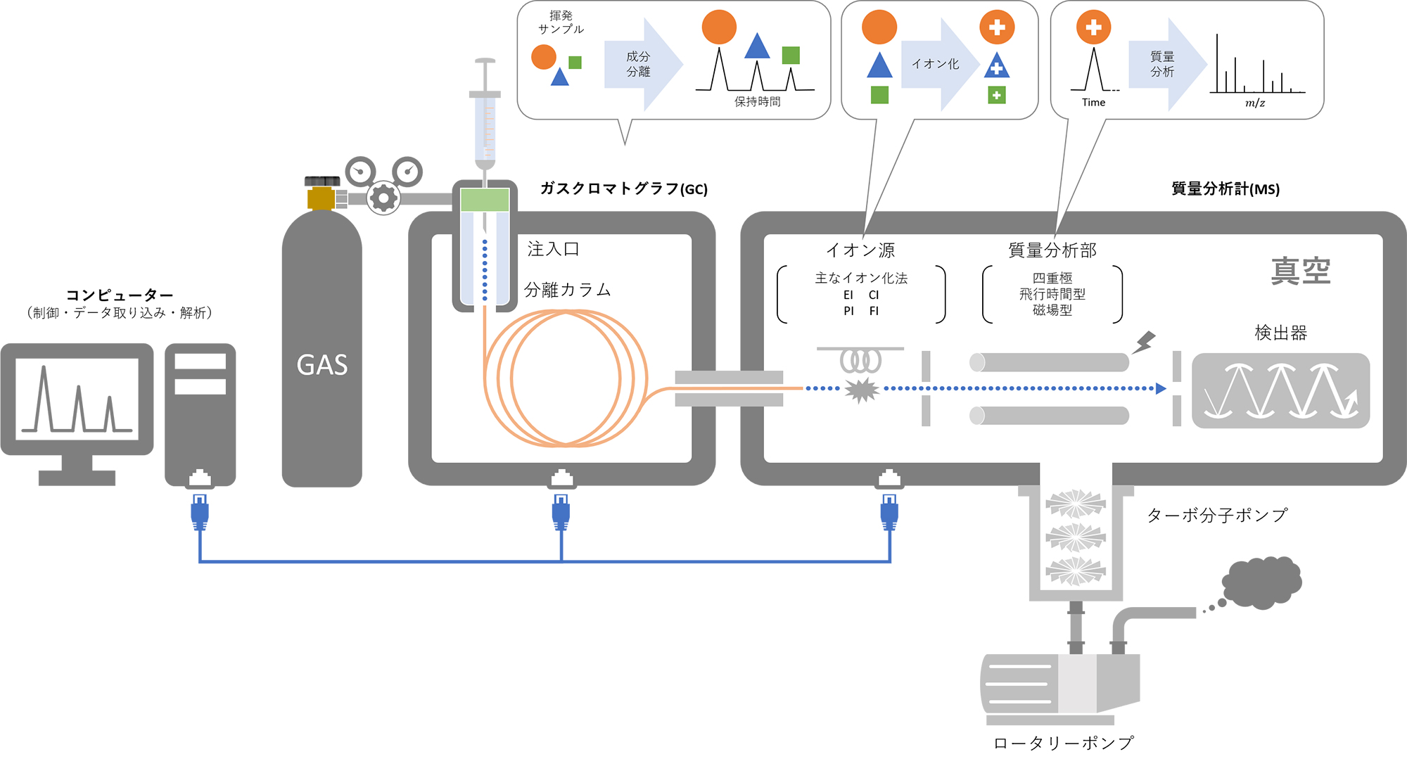 GC-MS 使用的 MS 包括四极杆质谱 (QMS)、三重四极杆质谱 (TQMS) 和飞行时间质谱 (TOFMS)。