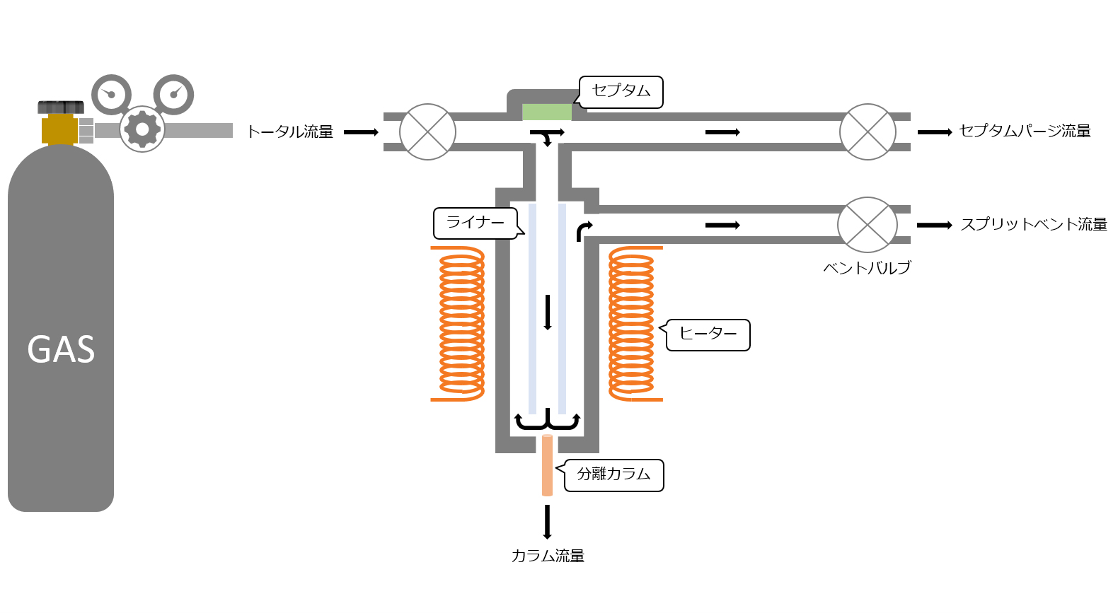 以任意分流比将一部分汽化样品引入分离柱。在分流模式下,确定分流比(色谱柱流速与分流出口流速之比)。通过考虑色谱柱上的负载量和目标化合物的灵敏度来决定。 - 不分流模式