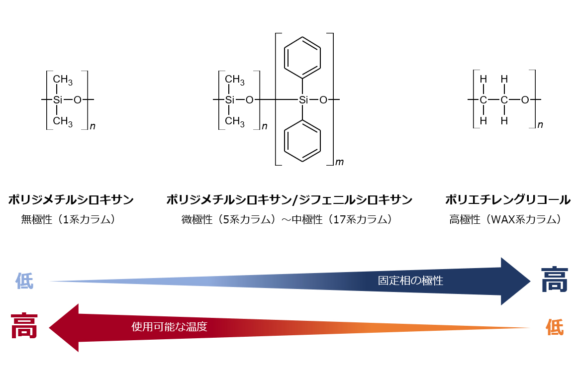 毛细管柱内壁涂有固定相,其特性(极性、最高操作温度等)根据固定相的类型而变化。一般来说,选择具有与目标分析物相似的性质的固定相将产生更好的亲和力和更好的峰形。当使用低极性色谱柱进行分析时,组分按照沸点顺序洗脱。