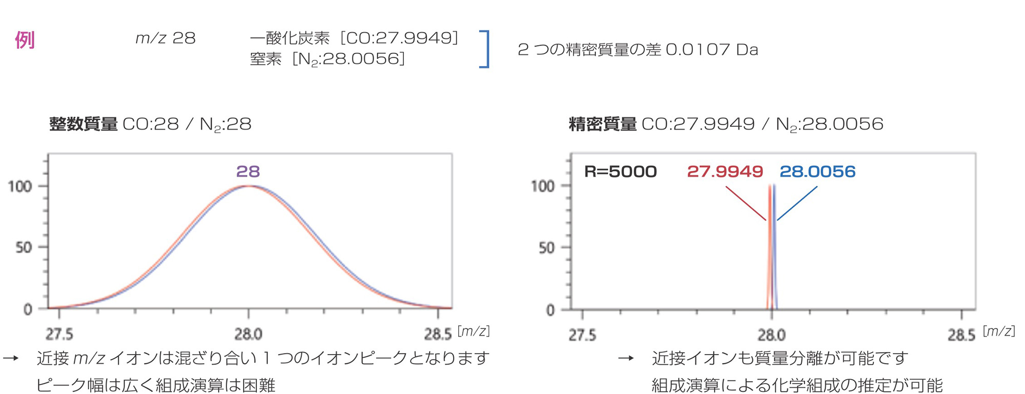 QMS/TQMS 和 TOFMS 的质量分辨率不同,因此获得的数据质量不同。一般来说,QMS/TQMS具有可以获得整数质量的质量分辨率,而TOFMS具有可以获得毫米(1/1000)量级的精确质量的质量分辨率。当需要精确的质量分析时,高分辨率 TOFMS 是理想的选择。