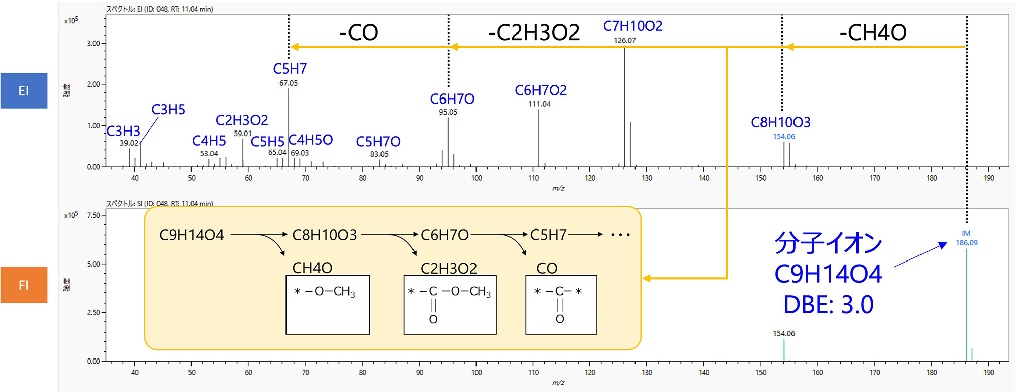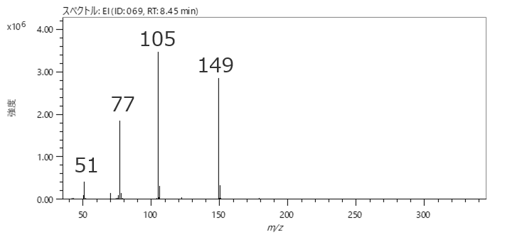 未知成分分析中获得结构式可以说是定性分析的最大目标。 EI质谱中观察到的大量碎片离子含有丰富的结构信息,因此可以利用其组成公式进行精确的结构分析。一般来说,高质量碎片离子表明官能团和部分结构,而低质量碎片离子据说适合化合物分类。还有化合物结构特征的碎片,例如麦克拉弗蒂重排。