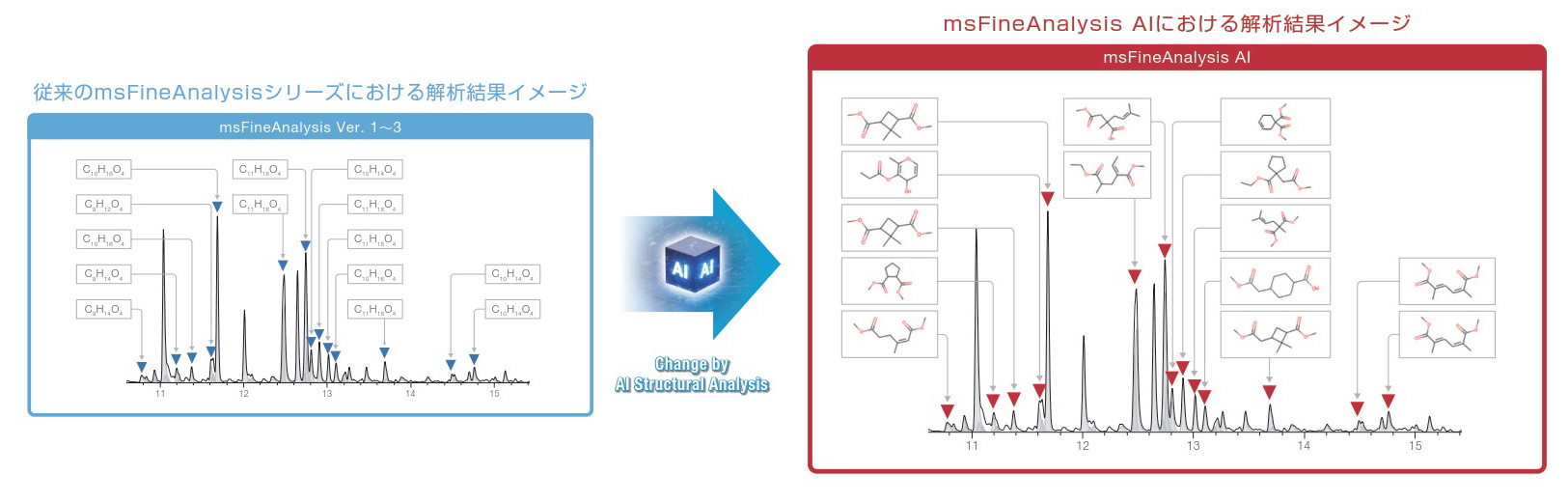 在我们公司,我们将使用上述EI法质谱进行的库DB检索与SI法质谱中的分子离子分析的组合称为“综合分析”。 msFineAnalysis系列是可以自动执行这种综合分析的软件。