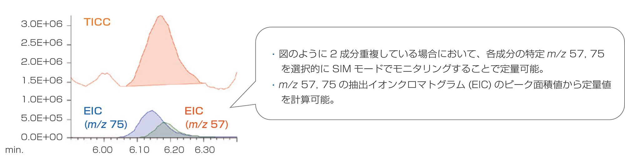 定量分析是确定样品中所含目标成分浓度的分析方法。通过使用 QMS/TQMS 扫描模式或 TOFMS 测量的数据创建源自目标成分的离子 EIC,可以进行定量分析。如果扫描模式下灵敏度不够,请在 QMS/TQMS SIM 模式下测量。另外,如果即使在SIM模式下灵敏度或选择性也不够,TQMS可以在SRM模式下执行更灵敏的测量,这将在后面描述。