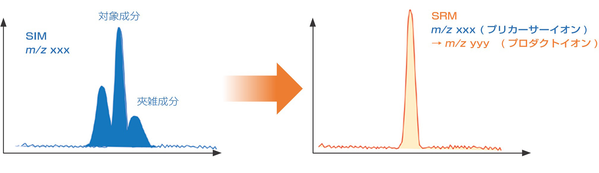 SRM 用于分析在 SIM 模式下无法准确量化的目标成分和干扰成分m/z重叠的矩阵数量的样品,也可以进行高度灵敏且可靠的定量分析。