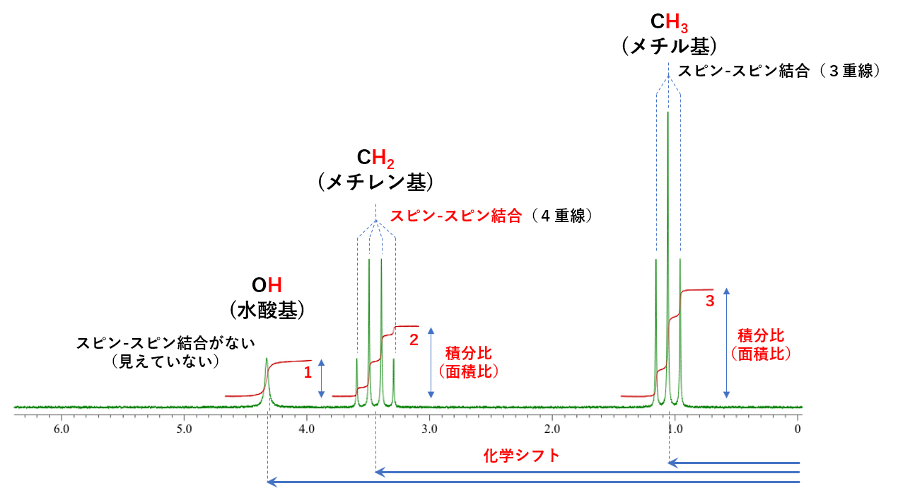 核磁共振信号中,即使对于相同的氢核,也会出现如图6所示的各种信号。图6是乙醇信号。这个核磁共振谱无线电波不是光,而是电磁波,因此被称为频谱,就像光一样,信号从右侧开始分为CH3(甲基)、CH2(亚甲基)和OH(羟基)。NMR 谱分为官能团组。化学位移这种化学位移类似于指纹,因为如果物质不同,信号会出现在不同的位置。