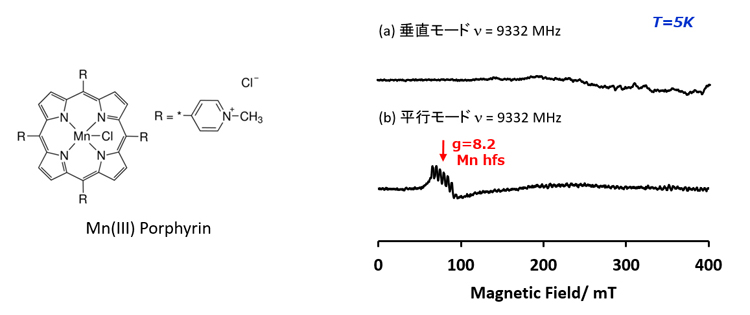 Mn3+卟啉复合物的 (a) 垂直模式和 (b) 平行模式检测的 ESR。在并行模式下,在 g=82 处观察到禁止跃迁。