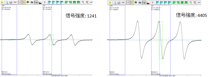 使用(左)标准样品管和(右)大直径样品管对 TEMPOL/苯溶液进行比较测量。