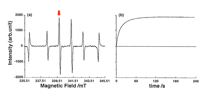 (a) ESR 谱沿磁场轴扫描。中心的四条线(强度比 1:2:2:1)源自 DMPO-OH。