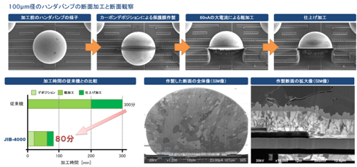 JIB-4000 采用高功率 FIB 镜筒,最大离子束电流为 60 nA,可实现高速处理。大电流的高速加工对于大面积加工特别有效,容易制作100μm以上的观察用截面。