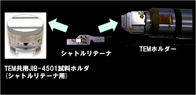 JIB 系列可以选择使其与 JEM 系列** 和 JSM 系列** 兼容。使用 JIB 系列制备的样品可以在 JEOL 产品之间以高通量传输,从而轻松执行更详细的分析。例如,如果使用穿梭固定器互换 JEM 系列的 TEM 支架(例如 JEM-ARM200F)的尖端和 JIB-4501 的载物台(图 1),则无需对安装在半月形网格上的 TEM 样品进行精细处理,从而进一步提高吞吐量。