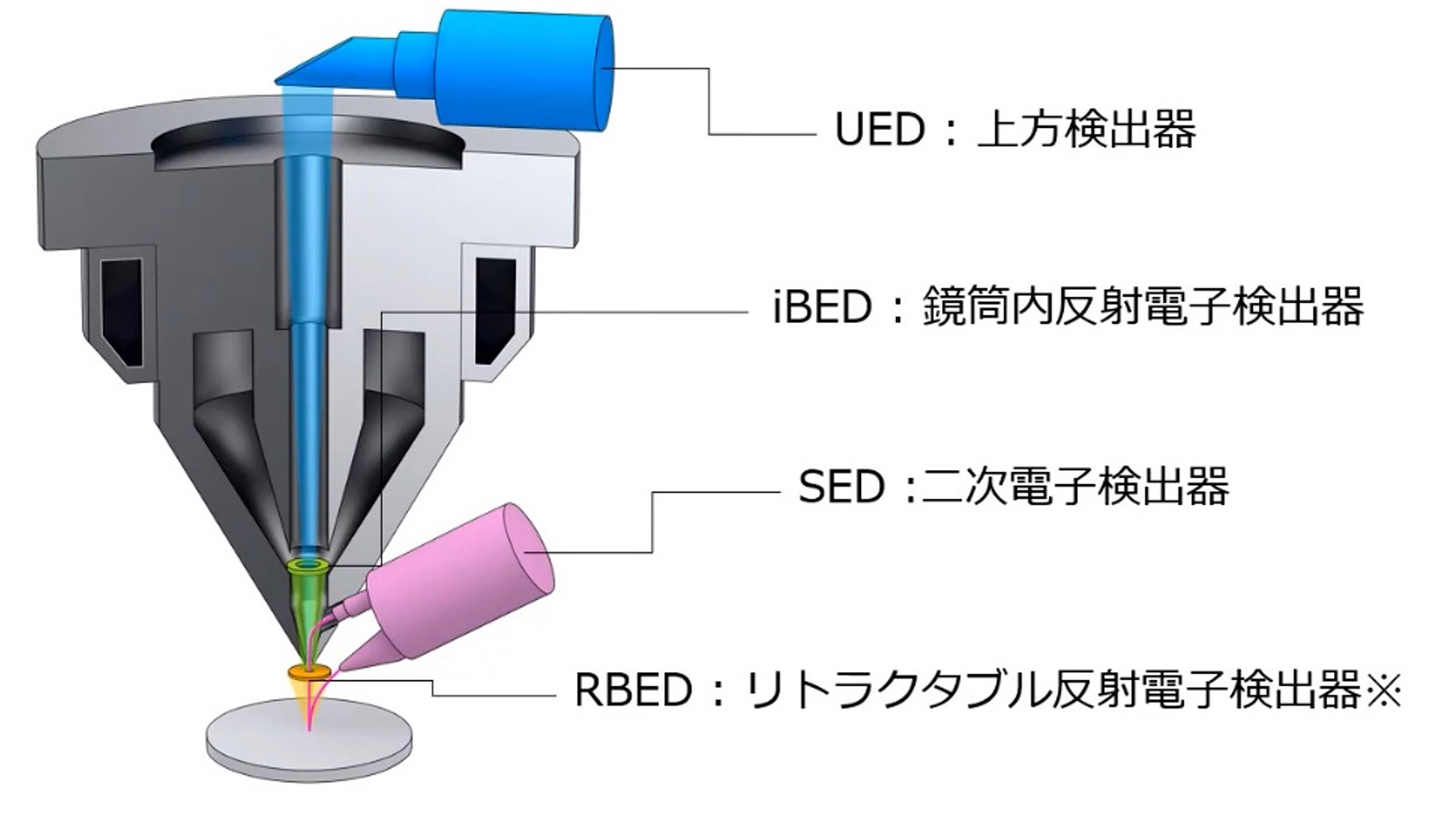 超紧凑、薄型可伸缩背散射电子探测器RBED※即使载物台倾斜也可使用。不仅可以观察样品表面,还可以使用二次电子检测器 SED 和上部检测器 UED 等各种检测器来观察需要倾斜观察的 FIB 截面,从而实现最佳的 SEM 观察。