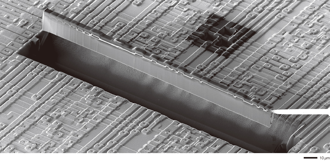 示例:半导体器件观察条件:加速电压3 kV,探测器SED二次电子像200×4×15μm样品块。 OmniProbe400※取出样本块