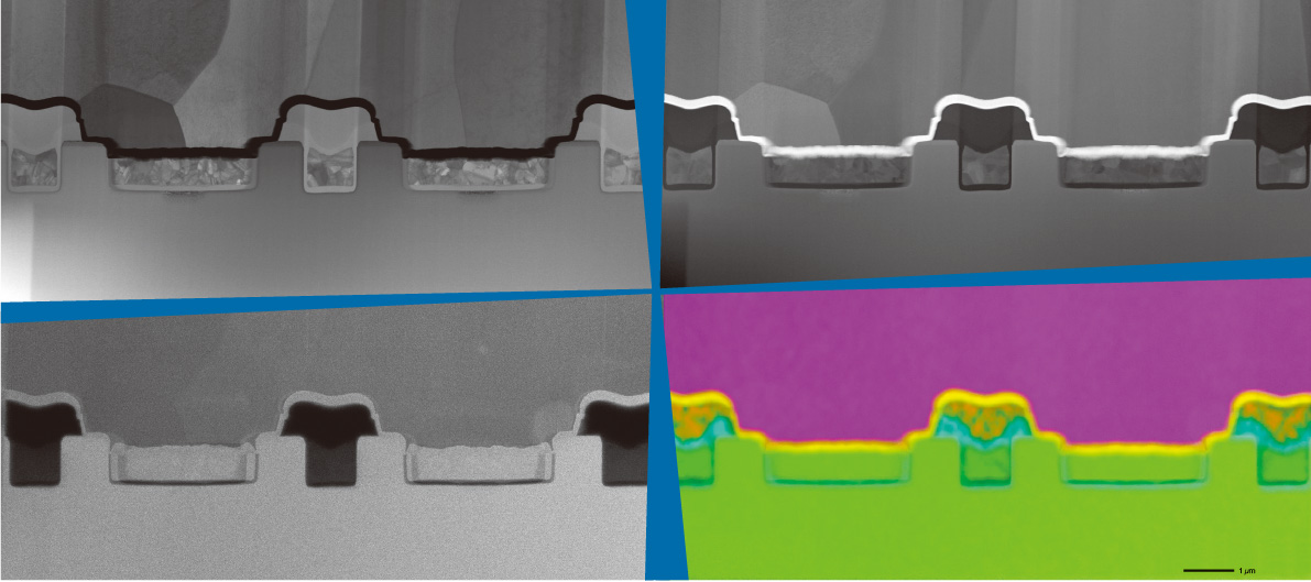 示例:3D NANO 闪存器件的 FIB 横截面观察条件:加速电压2 kV,探测器(左)SED二次电子像,(中)RBED背散射电子像,(右)UED背散射电子像