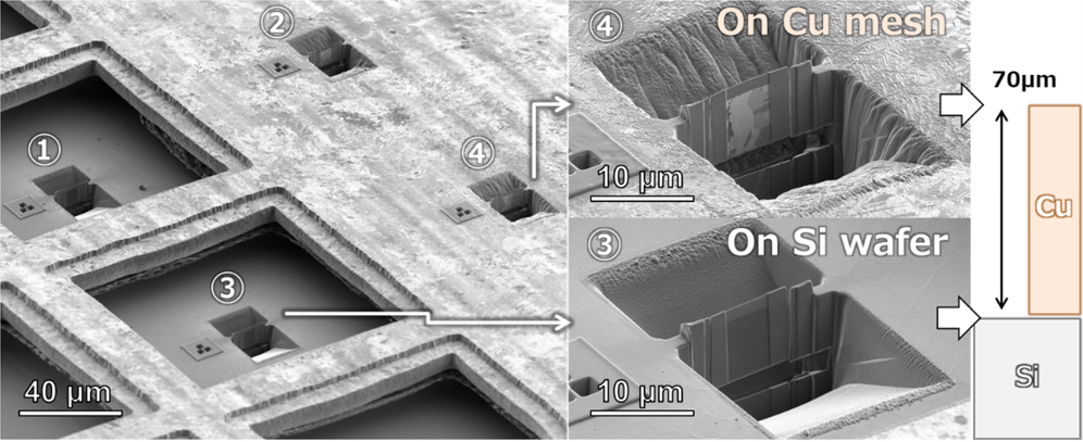 图3显示了使用台阶约70μm的样品制作薄膜样品的结果。可以在台阶上方和下方正确创建薄膜样品。