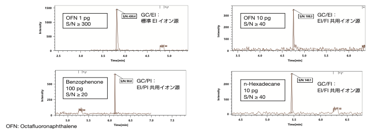 OFN 100 fg 使用标准EI离子源连续测量8次,并根据观察到的分子离子的提取离子色谱图的面积值及其再现性计算设备的检测下限,得到187 fg。