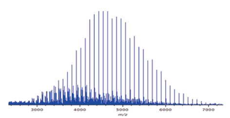 飞行时间质谱仪的特点之一是其宽的测量质量范围。通常,GC-MS 的质量范围上限约为 m/z 1,000,但 AccuTOF™ GC-Alpha 20 可以达到 m/z 6,000 或更高。通过将此特征与作为直接MS方法的FD方法相结合,可以测量低聚物。