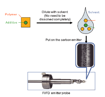 在FD方法中,样品用溶剂稀释,然后滴到发射器探针上并引入离子源。