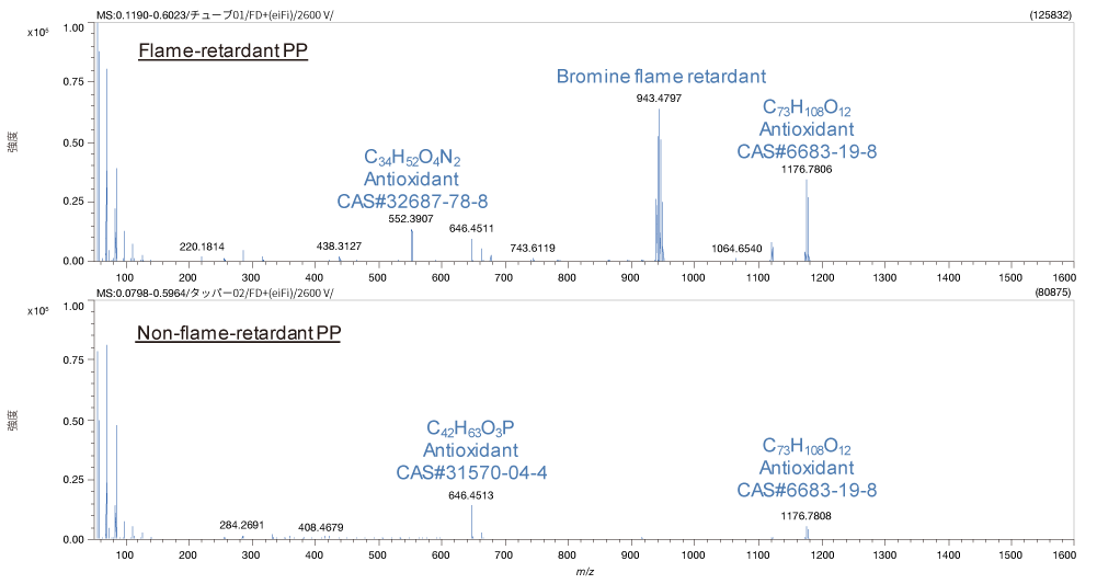 阻燃PP(上排)和非阻燃PP(下排)的FD质谱