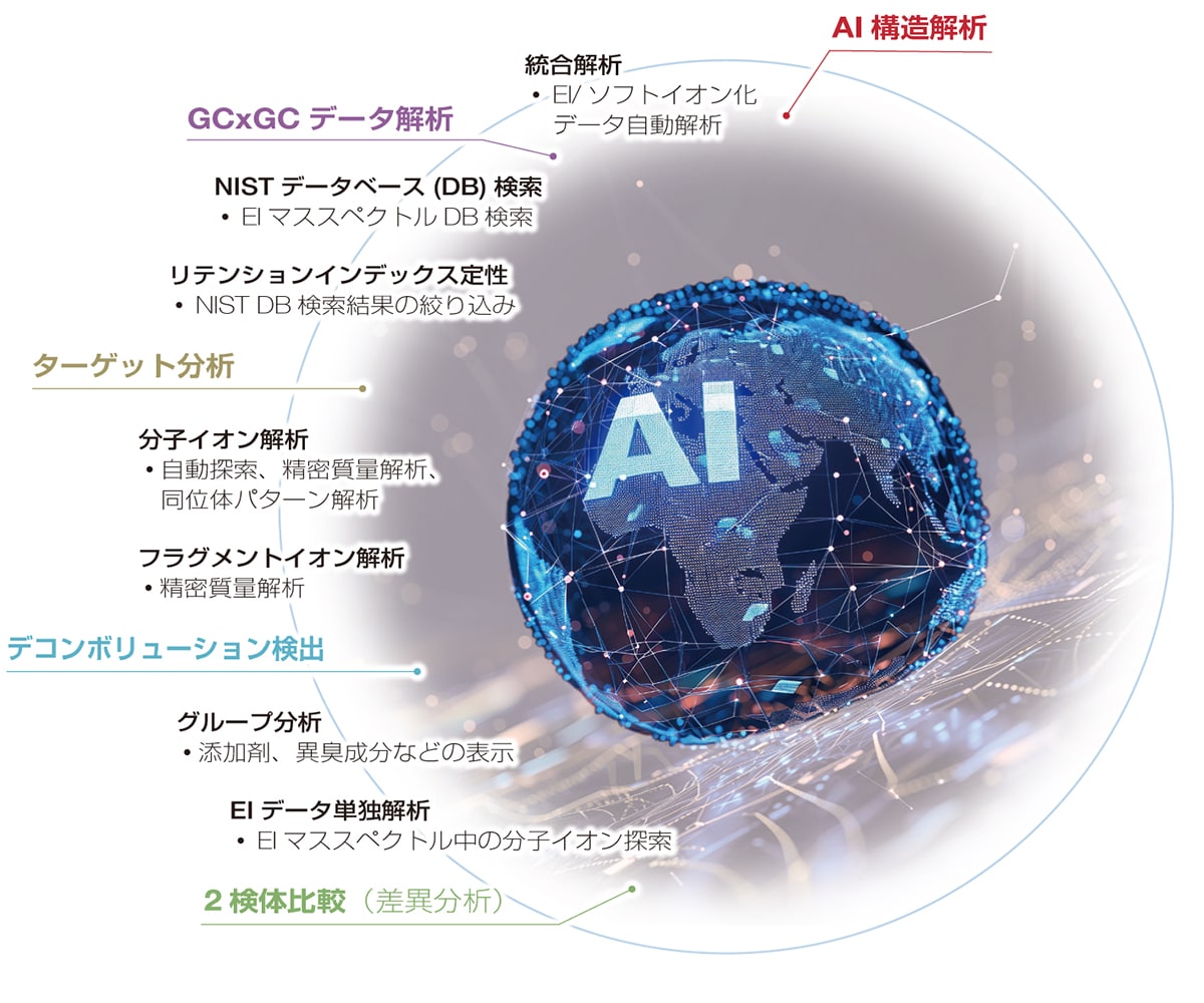 未知物质结构分析软件,实现结合GC/EI数据和GC/软电离数据的新定性分析“集成分析”,以及使用四种AI技术的“AI结构分析”。除了常规的GC-MS数据分析外,还支持全面的二维气相色谱(GCxGC)数据分析。