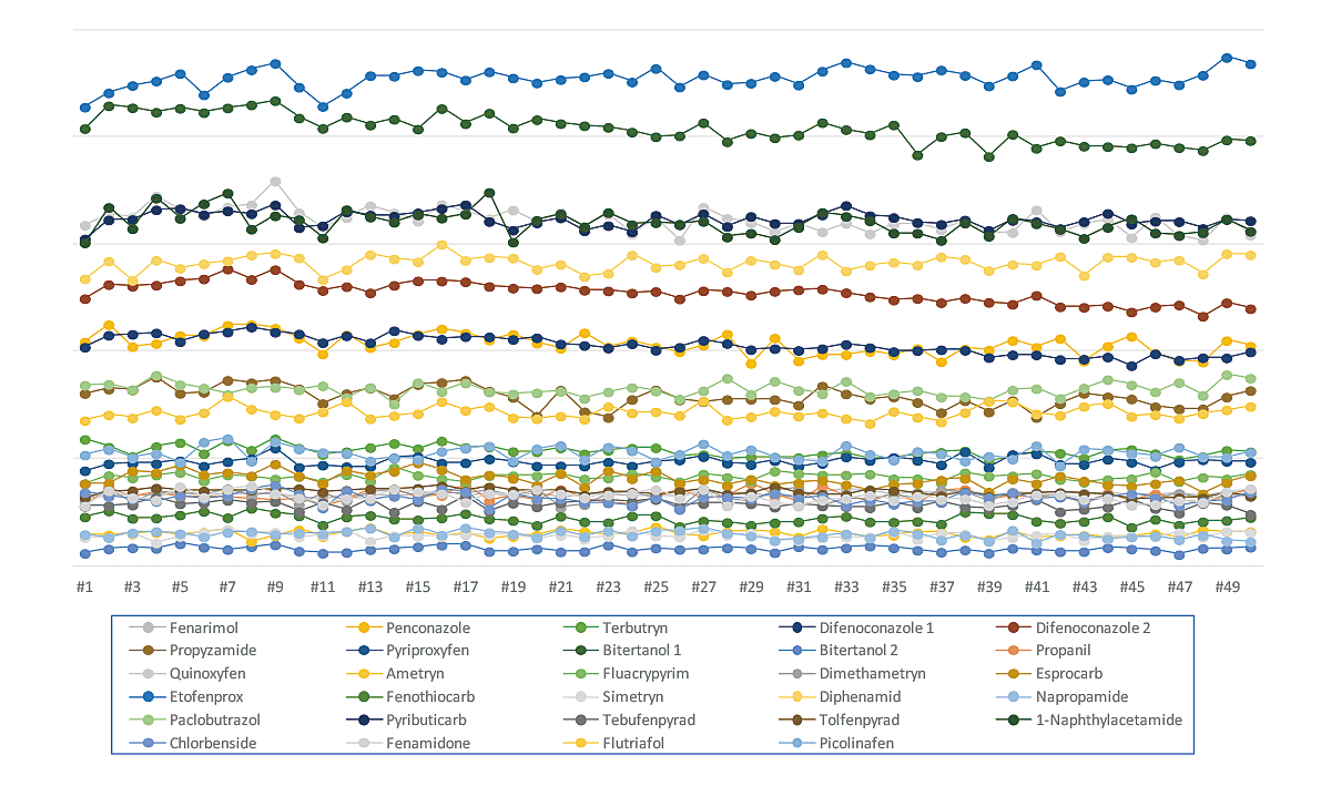 菠菜样品中添加 10ppb 农药成分的面积重现性 (n=50)