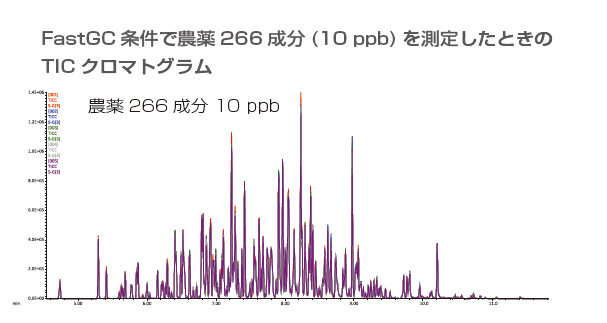 即使在 FastGC 条件下,10 ppb 的 266 种农药成分也能获得良好的保留时间重现性、良好的色谱形状和峰面积重现性。
