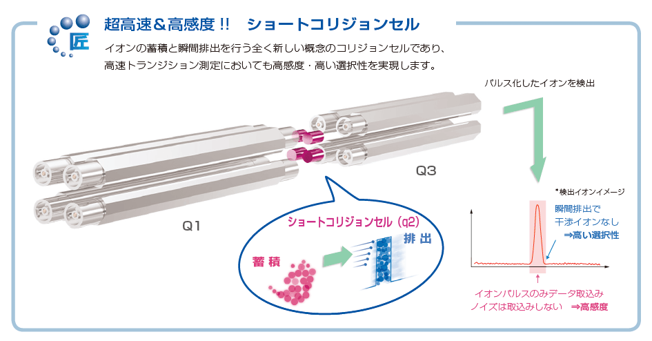 通过使用短的碰撞池,池中的所有离子都可以立即弹出,从而实现消除干扰离子的高选择性和业界最快的 SRM 速度。