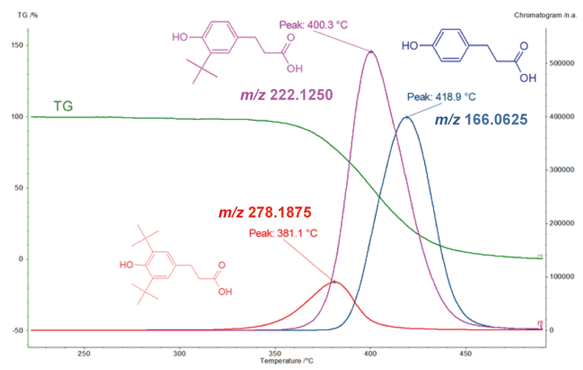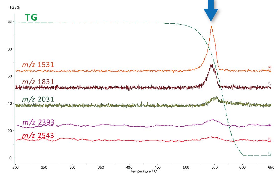 TG-MS不具有色谱分离功能,可通过结合软电离和精确质量分析(这是TOFMS的特征)对同时观察到的多种成分进行定性分析。 TG-TOFMS 被认为是对合成聚合物基础材料和添加剂进行详细热分析和分析的强大分析工具。