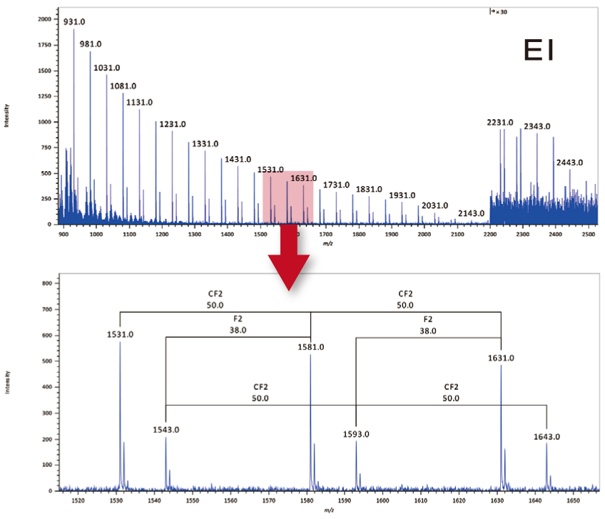 具有源自氟树脂的重复单元的高质量离子 (m/z多达约 2,500 个)被大量观察到。结果表明,TG-TOFMS 比常规 TG-QMS 具有更宽的可测量质量范围,可用于测量低聚物区域的合成聚合物。