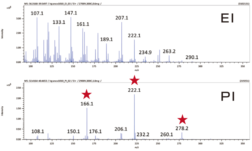 At this time, by using the PI method, we were able to confirm molecular ions down to polystyrene hexamers Even if thermal decomposition products occur simultaneously, it is possible to confirm them using molecular ions using the PI method