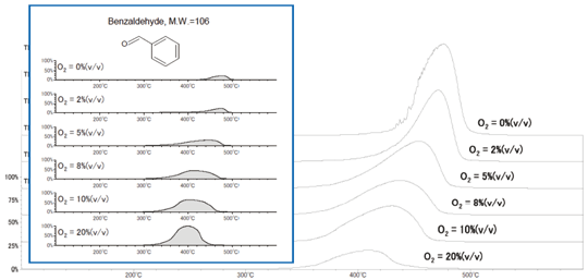 观察到,随着氧浓度增加,产生的苯甲醛的量增加,苯甲醛被推测为苯乙烯的氧化物,苯乙烯是聚苯乙烯的热分解产物。