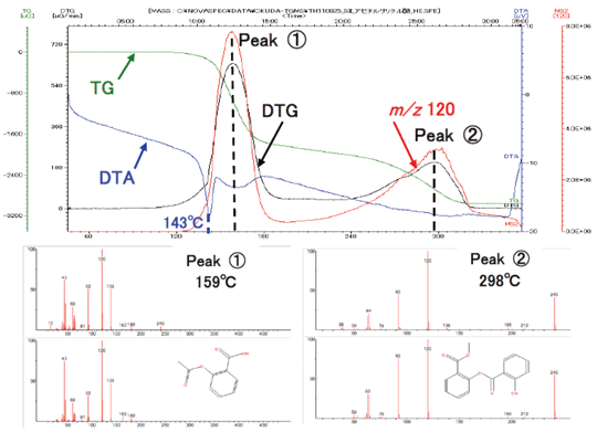 使用TG-MS测量乙酰水杨酸粉末的热行为,结果发现它在120°C以下是稳定的,但在更高的温度下会发生汽化(Peak①)和聚合(Peak②)等变化。