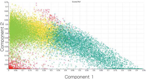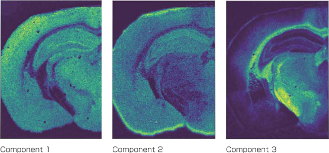 我们根据上述数据中检测到的大量峰,使用质量成像数据分析软件 SCiLS Lab MVS 进行了统计分析。利用JMS-S3000 SpiralTOF™-plus的高质量分辨率,可以搜索特征区域(分割)并提取特征区域的质谱。