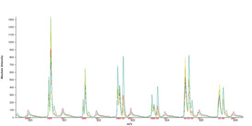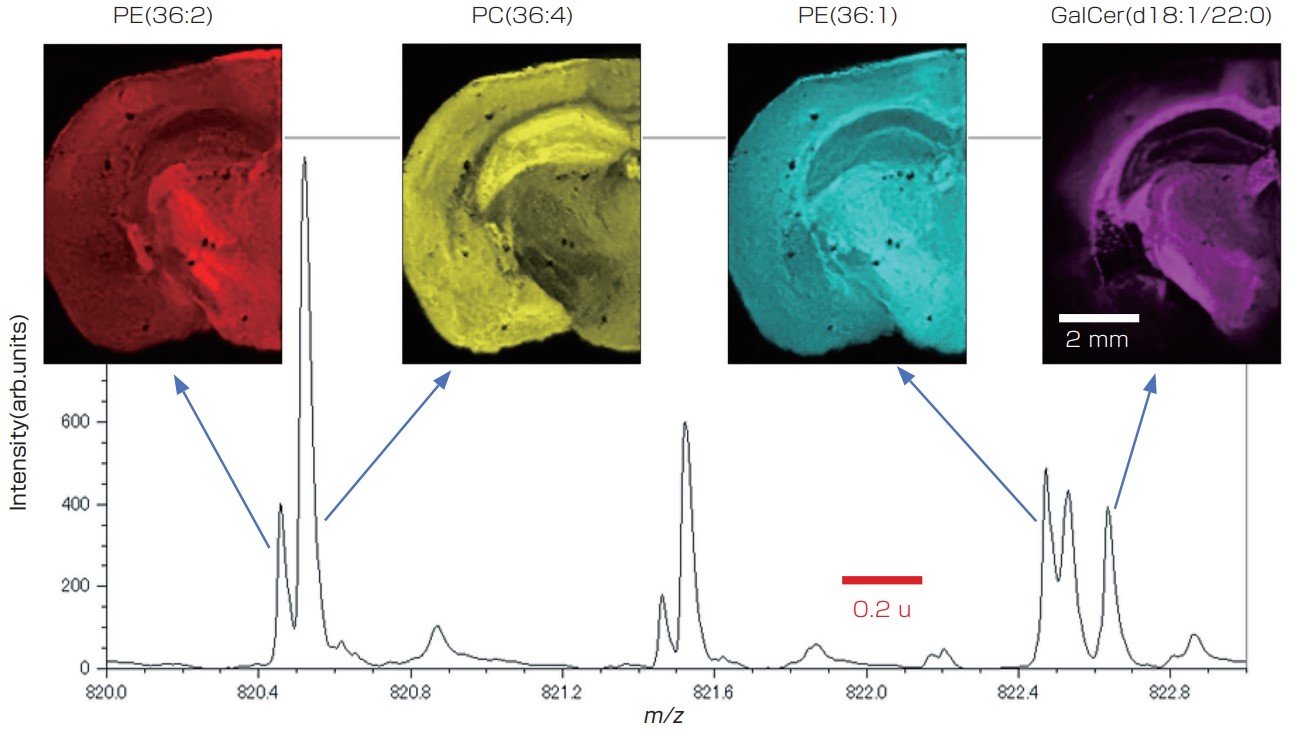 小鼠大脑切片中存在多种脂质,m/z从700到1,000获得复杂的质谱。这些峰大部分是痕量成分,不到基峰的 10%。因此,针对脂质的质量成像需要接近基线的高质量分辨率。如下图所示,m/z我发布了820-823的放大图。已观察到许多质量差异约为 01 u 的峰。利用 SpiralTOF-plus 30 的高质量分辨率,我们分离了同量异位离子峰,并通过精确的质量测量估计了四种脂质的组成。此外,如果您绘制特定于每种化合物的图像,您将看到每种化合物显示出不同的定位。传统的反射器 TOFMS 很难分离 01 u 以下的颗粒,从而难以估计脂质成分,并导致定位信息混合。