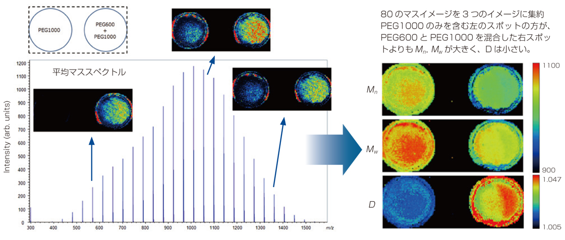 为了解决这个问题,msMicroImager™(可选)现在允许您对聚合物的数均分子量 (Mn)、重均分子量 (Mw) 和多分散性 (D) 进行成像。这使得从每个聚合度和同位素峰衍生的数十到数百个质量图像可以聚合成三个图像,从而可以更直观地分析聚合物的空间分布。